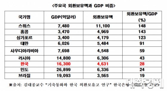 ¿Üȯº¸À¯°í/GDP ºñÁßÀ» º¸¸é Çѱ¹Àº 28%·Î °¡Àå ³·Àº ÆíÀÌ´Ù. ½ºÀ§½º 148%, È«Äá 143%, ½Ì°¡Æ÷¸£ 123%, ´ë¸¸91%, »ç¿ìµð¾Æ¶óºñ¾Æ 59%·Î ¿ÜȯÀ§±â¿¡ öÀúÇÏ°Ô ´ëºñÇϰí ÀÖ´Ù.